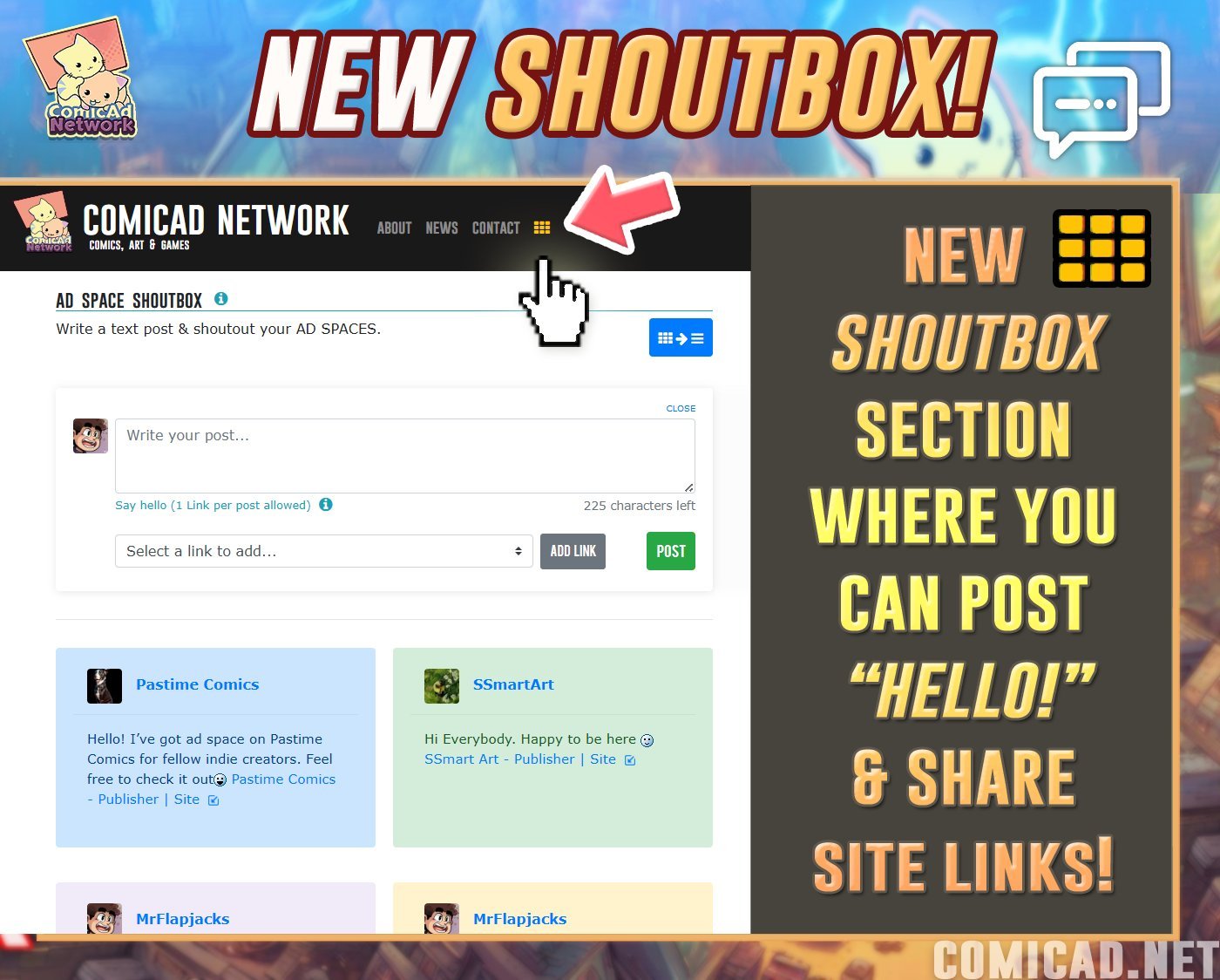Hey Everyone! Comicad.net now has a brand new SHOUTBOX area, where you can POST and say "Hello!" You can also share your Ad Spaces & Site Profiles too, if you want! So say "Hey" and chat with your fellow artists & creators!